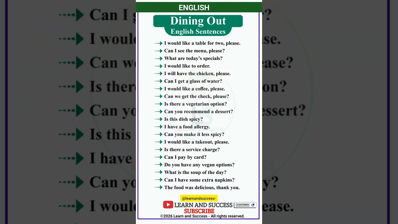 #EnglishLearning #LearnEnglish #DiningOut #EnglishPhrases #LearnAndSuccess #ESL #StudyEnglish #Vocabulary