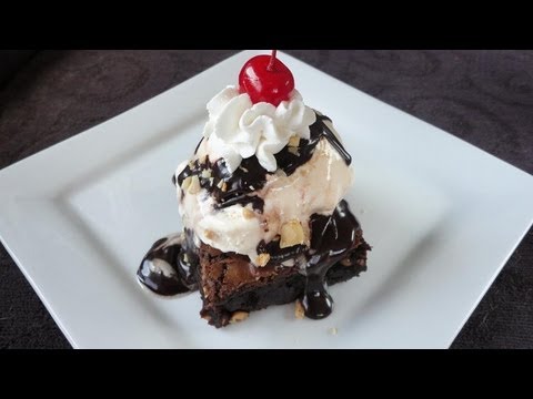 Place one brownie in a bowl or on a small plate. Put one scoop of the ice cream on top. Drizzle the warm hot fudge sauce on top. Sprinkle chopped peanuts over that. Top with whipped cream and a cherry. Enjoy!!