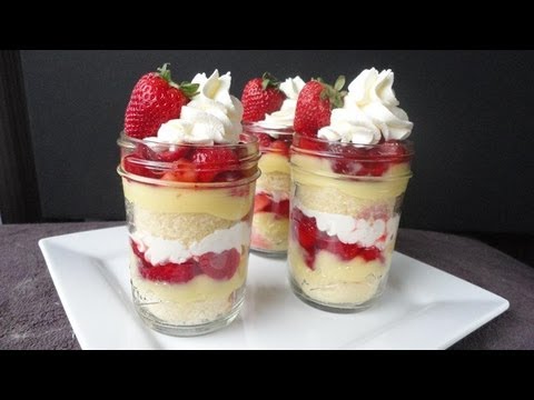 To assemble the mini trifles, place a slice of pound cake in the bottom of the jar. Put a spoonful of pudding on top of the cake. Next, place a spoonful of the macerated strawberries and finish with a layer of whipped cream. Repeat using another round of pound cake, another spoonful of pudding, another spoonful of strawberries and finally, top with a nice rosette of whipped cream on top. Repeat until you run out of ingredients. You may have some pudding left over but not much. Makes 6 mini trifles. Store in the refrigerator until ready for serving or up to 4 days. Enjoy!!