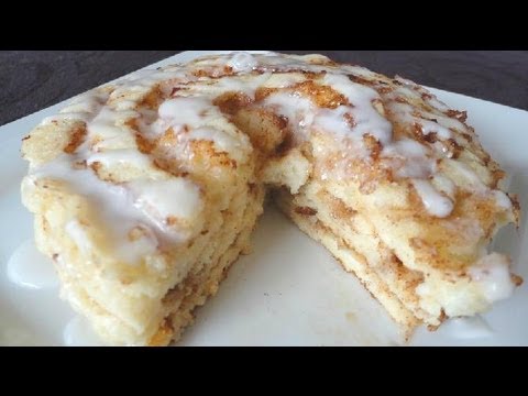 Make desired size pancake on greased griddle and then using the piping bag and starting at the center of the pancake, create a cinnamon swirl. Wait until the pancake has lots of bubble before you try to turn it. You will find that when you turn it the cinnamon swirl will melt. The cinnamon will melt out and create the craters which the cream cheese glaze will fill.