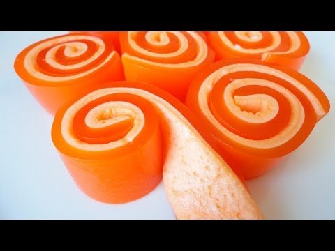 When throughly chilled, roll up Jell-O sheet in the pan and put your log onto a cutting board. Using monofilament or unflavored dental floss, cut into 1″ slices like you would cinnamon rolls. Place onto a plate and keep refrigerated until serving. Makes 8-9 1″ slices. Enjoy!