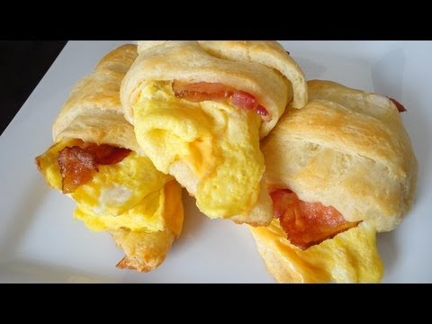 Unroll crescent roll dough and separate into triangles like you normally would. Place half a slice of cheese on the wide end, then a piece of scrambled egg, then a slice of bacon or sausage. Roll up, stretching the end tip as necessary to allow it to go on the bottom. Place onto an ungreased cookie sheet and bake at 350*F for 12-15 minutes. Makes 8 breakfast roll ups. Enjoy!