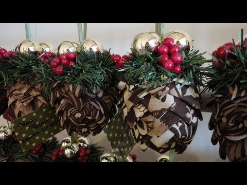 How to make folded fabric pine cone ornaments like the ones I did for the ornament exchange. You can use any selection of fabric for these; I used patterned fabrics with brown being the main color. You can also use ribbon instead of fabric.