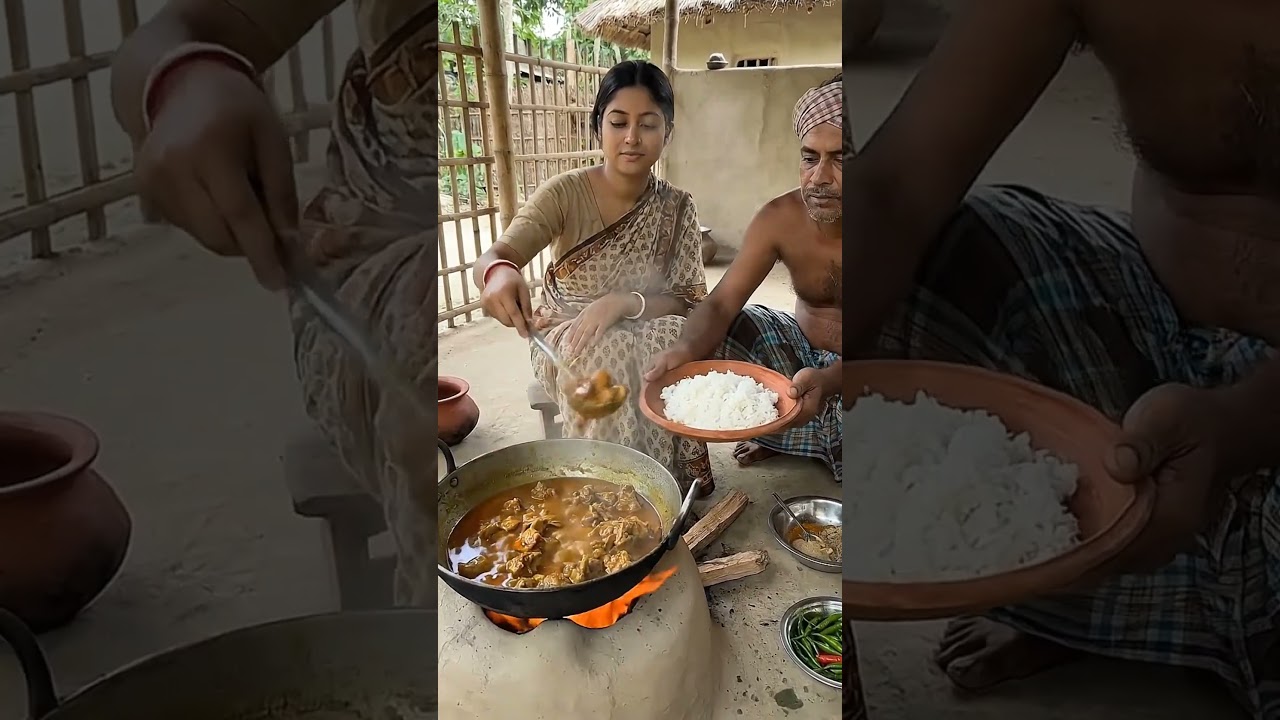Experience authentic village life through traditional Bengali cooking! In this heartwarming rural kitchen scene, a homemade desi chicken curry is slowly cooked on a traditional clay stove using fresh spices and natural ingredients. This real village food culture showcases the beauty of simple living, wood-fire cooking, and authentic South Asian flavors loved across Bangladesh and India.