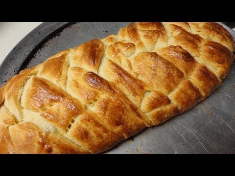 On a cookie sheet, unroll crescent roll dough without separating and placing the long edges together. Pinch and press seams together so one piece of dough is formed. Place filling across the center of dough, leaving an inch or two of dough exposed on the ends. Cut dough into strips on either side just up to the filling making sure there are an equal number of strips on both sides. Start braiding by folding up an end and then folding the strips over each other, one side after the other. At the end, fold the end up and pinch off any dough not needed to enclose the filling.