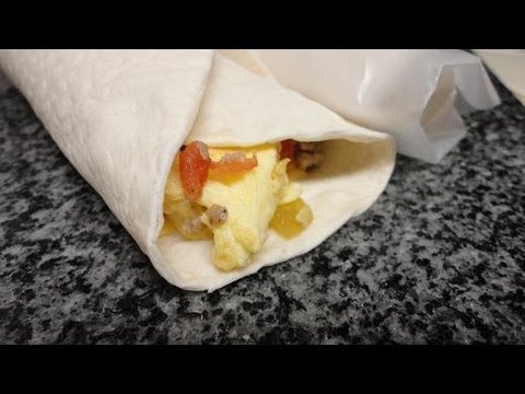 Lay out one tortilla on each piece of waxed paper. Fold cheese in half and lay across tortilla at an angle. Add 1/16 of egg/sausage mixture. To roll, bring bottom of tortilla up and over the eggs, pulling back to make the roll tight. Fold over the bottom corner of waxed paper, then a side corner, folding the tortilla over about 1″. Fold over the other corner of waxed paper, not folding the tortilla with it. Then continue rolling. If you wish, microwave for 15-20 seconds to reheat burrito.