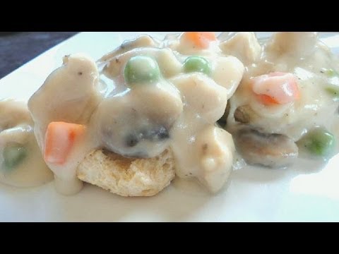 Cut chicken into bite sized pieces and cook until done (I simply put into a pot with enough water to cover adding parsley flakes, onion and garlic powder and salt. When cooked through, drain). Set aside. In a medium saucepan, sauté mushrooms over medium-high heat in olive or vegetable oil until browned. Set aside. In the same pan, melt butter over medium heat. When almost completely melted, whisk in flour. Cook for one minute. Gradually whisk in chicken stock or broth and milk. Make sure to whisk in the liquid slowly to prevent lumps. Add in the cooked chicken and mushrooms, frozen peas and carrots and salt and pepper. Bring to a boil, stirring constantly. Boil for 1-2 minutes to cook flour. Serve over biscuits. Serves 5-6. Enjoy!