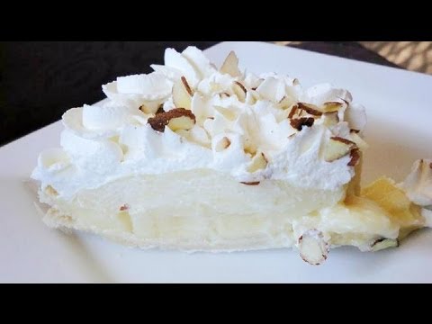 How to make a delicious banana cream pie from scratch! A vanilla custard-like pudding over sliced bananas in a pastry pie crust with real whipped cream and sliced almonds. Simply delicious!