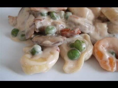 Tri-color tortellini in a creamy aflredo-eqsue sauce with prosciutto, mushrooms and peas. Kind of like what they served at Green Mill and Pasta Factory.