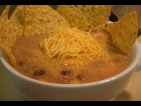 To serve, put tortilla chips into bottom of bowl and ladle soup over top. Garnish with more chips, shredded cheese and sour cream, if desired. Enjoy!