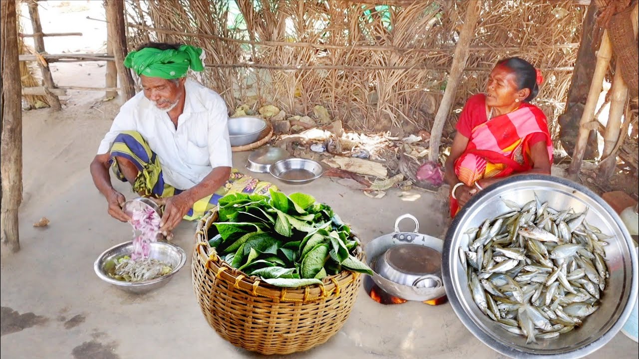 ALOO SHAK VAJI & MIXED SMALL FISH CURRY cooking and eating by santali tribe old couple