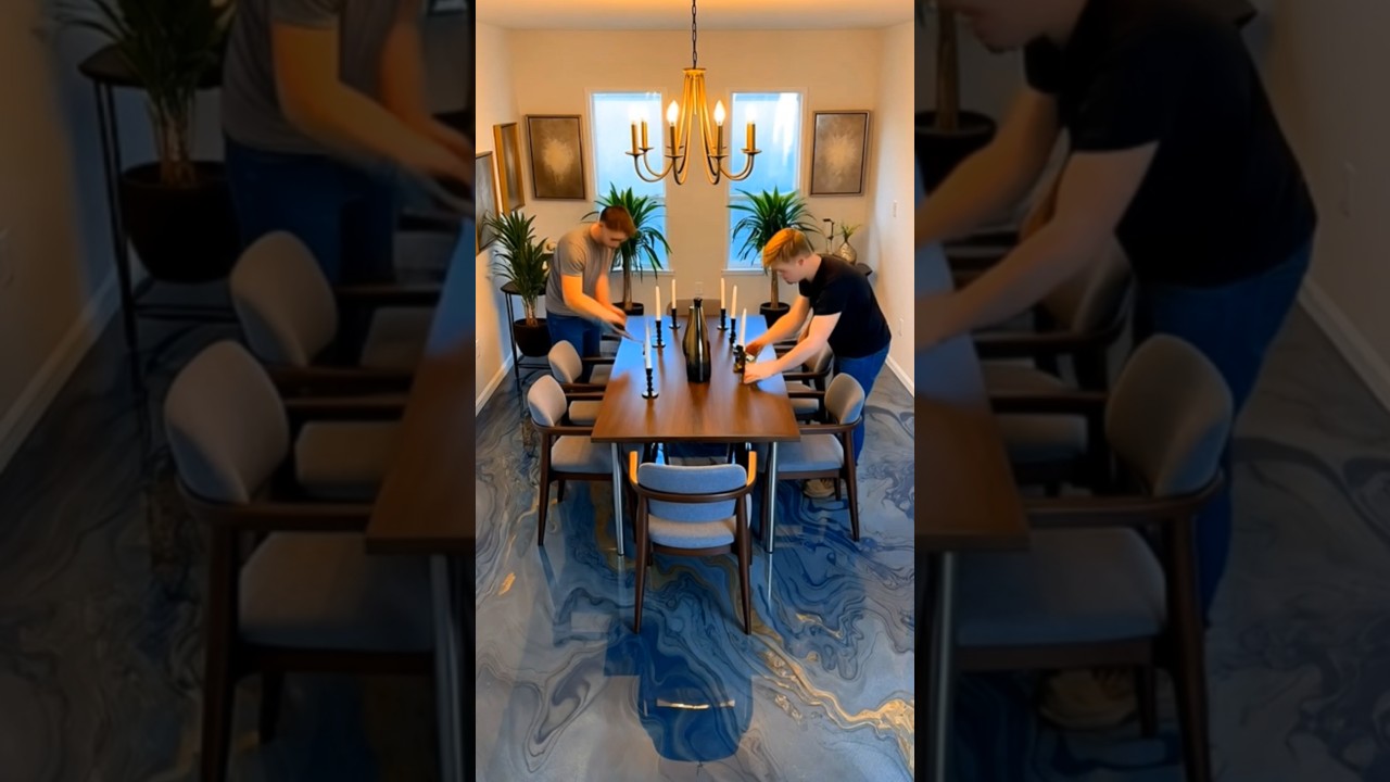 In this timelapse renovation, workers prepare the raw concrete floor, apply a beautiful metallic epoxy coating, and transform the room into a modern dining space with a glossy marble-style floor. The charcoal, silver, gold, and blue pigments create a mirror-like surface that reflects light and furniture beautifully.
