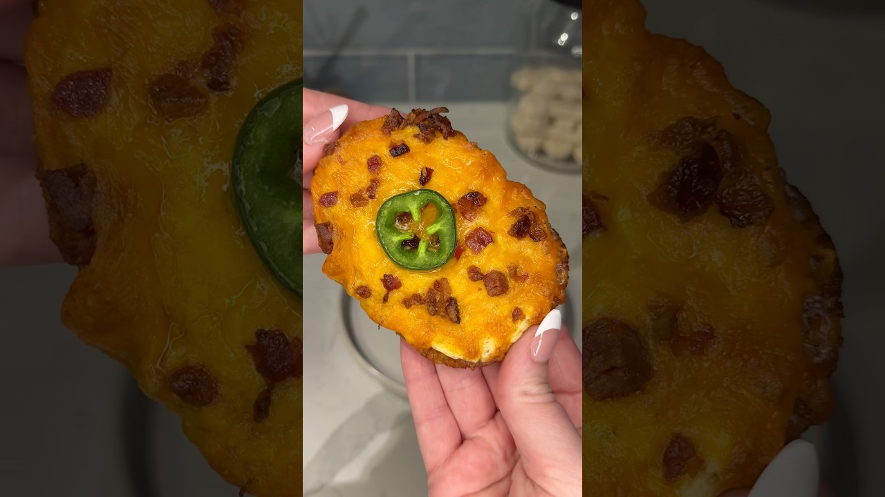 Instructions:Bake hashbrown patties at 400º for 14 minutes on a parchment-lined baking sheet, flipping halfway through. Top with sour cream ranch dip, cheese, bacon crumbles, and 1 jalapeño slice. Bake another 5-10 minutes until cheese is melted and bubbly. Allow to cool slightly and enjoy! 😋