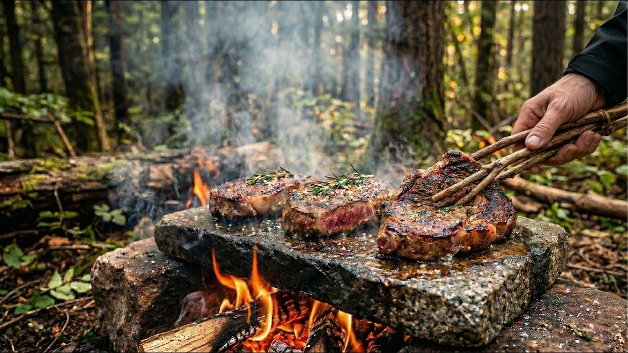 In this episode, we’re taking primitive cooking to the next level. We found a massive natural stone in the heart of the forest, heated it over a roaring fire, and seared three giant sirloin steaks to perfection. No grill grates, no modern stove—just fire, stone, and incredible meat.