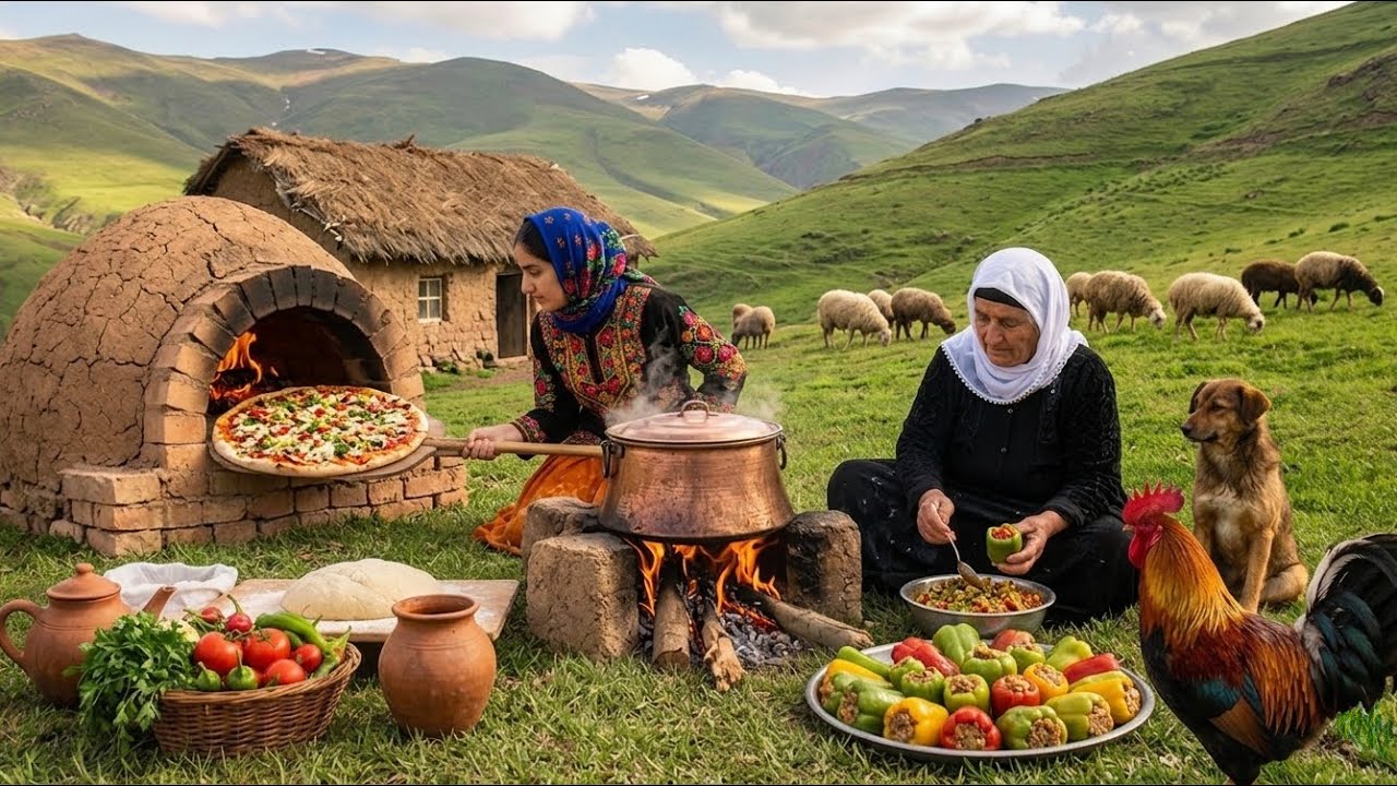 Life in an Iranian village looks so vibrant and cozy 🌾🍲 Cooking Loobia Polo, Biber Dolma, and even a giant pizza 🍕✨ Love seeing traditional flavors mixed with fun, homemade creativity!