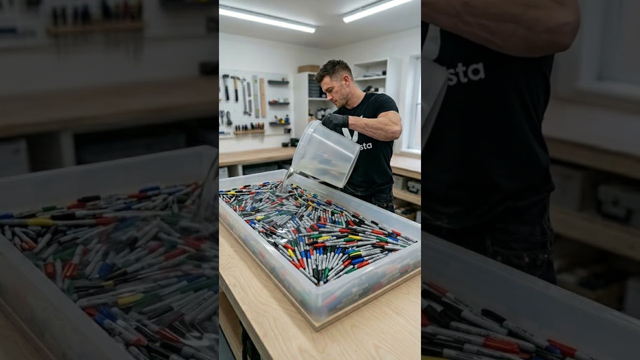 I filled a full-size rectangular dining table mold with loads of Sharpie-style markers, poured crystal-clear resin all the way to the brim, then polished the surface until it looked like solid glass.