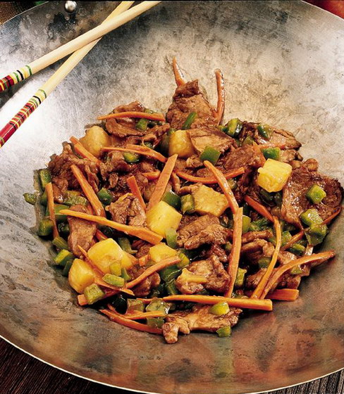 7. If necessary, add up to 2 tbsp. of additional oil to skillet. Stir-fry green pepper, carrots, and pineapple chunks for about 3 minutes. Blend thoroughly with pork and serve.
