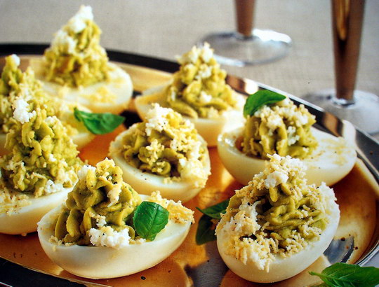 1. Reserve two of the hard-boiled eggs and halve the remainder. Carefully remove the yolks with a teaspoon and blend them with the avocados, garlic and oil, adding freshly ground black pepper and salt to taste. Spoon or pipe the mixture into the halved egg whites using a piping (pastry) bag with a 1cm/ 1/2in or pipe star nozzle.