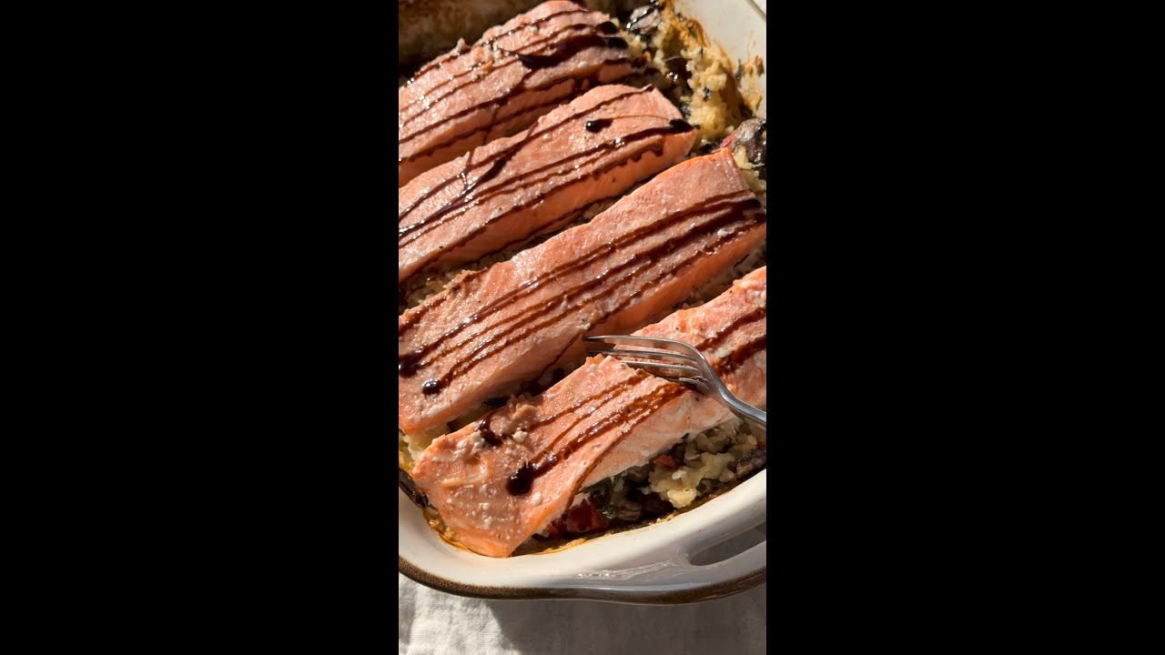 @gathering.page I cannot get enough of one-pan dinners, and this one doesn’t disappoint! It’s got so much flavor from the mushrooms, sun-dried tomatoes, and Boursin cheese that’s baked into the fluffy rice. Topped with salmon to make it a delicious dinner!