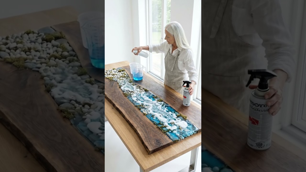 She placed real river stones and moss inside a live edge walnut slab — then sealed a crystal glacial river forever under flawless mirror-polished epoxy resin.