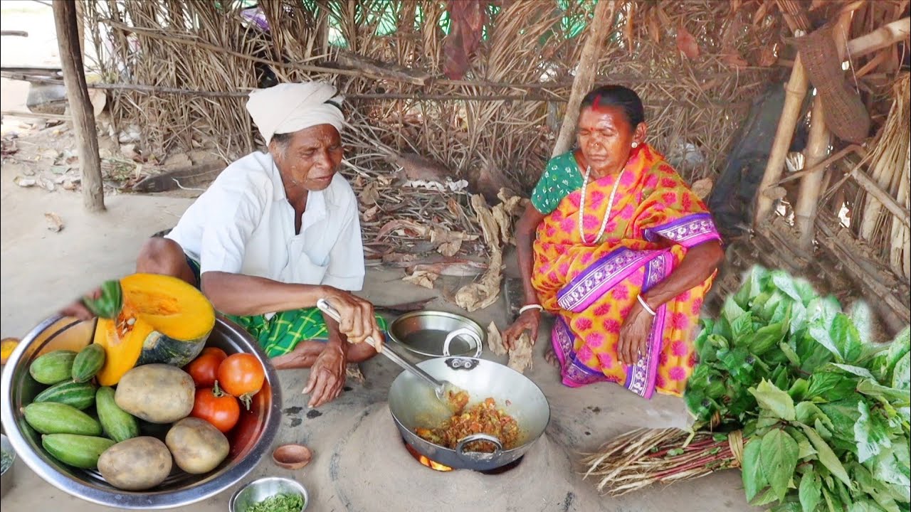 Indian Tribe Santali Couple cooking lunch Menu VEGETABLE CURRY and JUTE LEAVES DAL