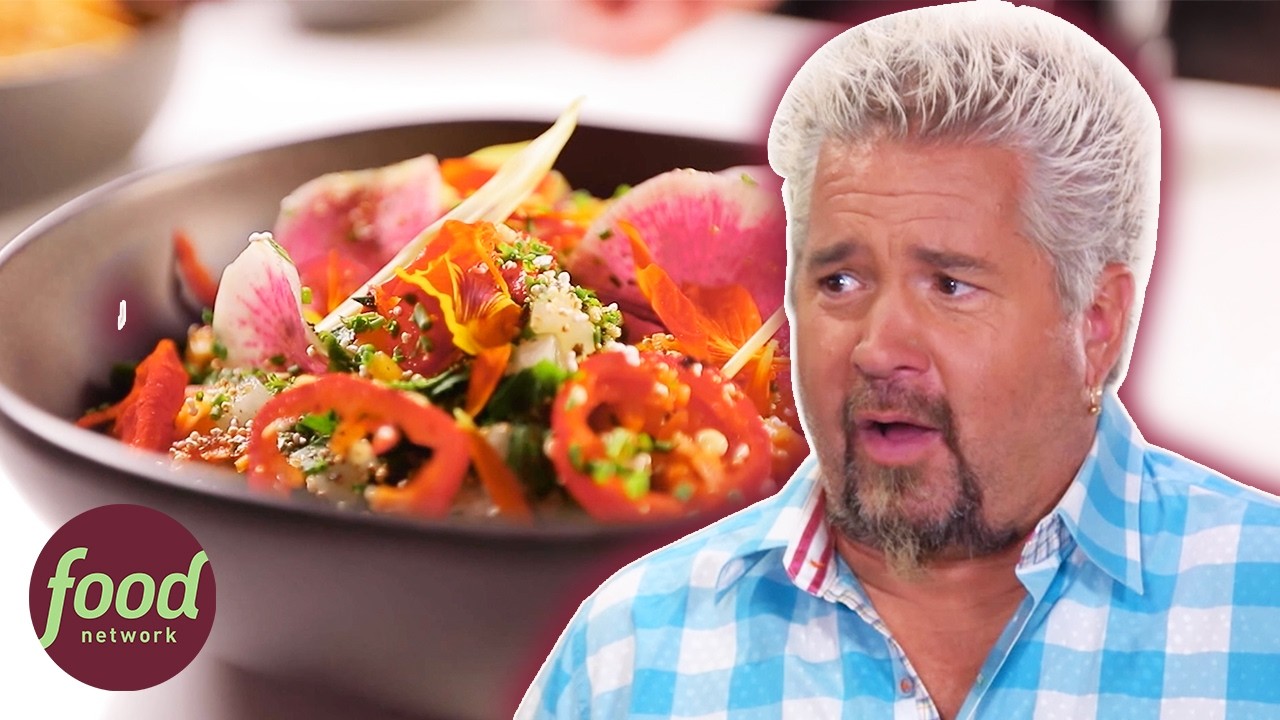 Guy Fieri visits Grand Junction’s Taco Party, where gourmet chefs elevate street food. They serve inventive hot chicken and cauliflower tacos, ending with a “masterful” multi-textured seasonal guacamole.