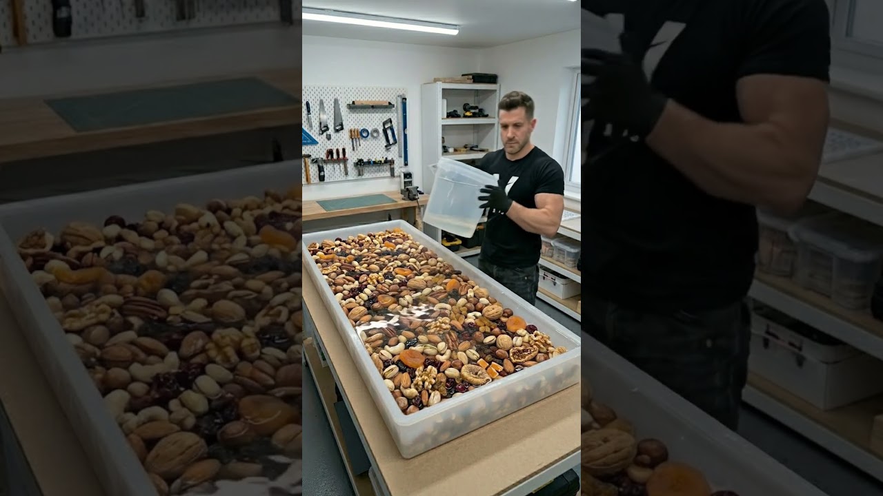 I filled a full-size rectangular dining table mold with a rich mix of nuts and dried fruit, poured crystal-clear resin all the way to the brim, then polished the surface until it looked like solid glass.