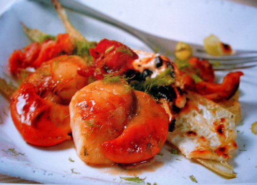 This dish is a delicious combination of succulent scallops and crispy bacon,seaved on a bed of tender fennel and melting mascarpone.if you can’t get large scallops(known as king scallops),buy the smaller queen scallops and serve a dozen per person.if you buy scallops in the shell,wash and keep the pretty fan-shaped shells to serves a range of fish dishes in.