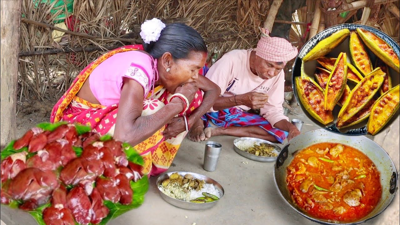 CHICKEN LIVER CURRY & POTOL VAJI cooking and eating by santali tribe old couple