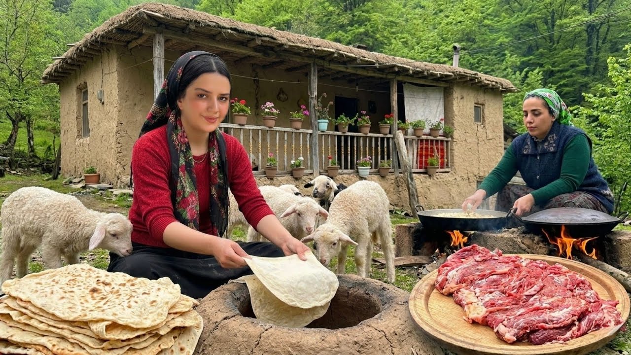 Rural life in IRAN; Cooking lavash bread with meat