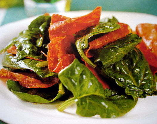 Spanish chorizo sausage contributes an intense spiciness to any ingredient with which it is cooked. In this hearty warm salad, spinach has sufficient flavour to compete with the chorizo. Watercress or arugula could be used instead of the spinach, if you prefer. For an added dimension use flavoured olive oil-rosemary, garlic or chilli oil would work perfectly. Serve the salad with warm crusty bread to soak up all the delicious cooking juices.