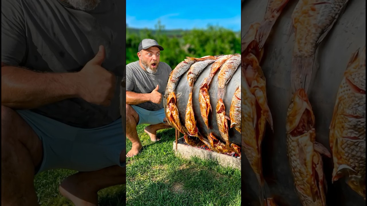 A massive trout grilled to perfection using a homemade barrel, creating a smoky flavor and juicy texture. The outside develops a rich, crispy layer while the inside stays tender and full of natural taste.