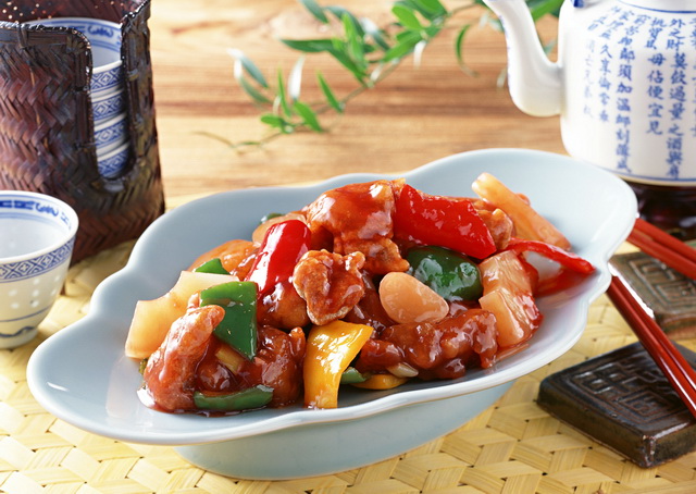 5.To make sweet and sour sauce: Put the white vinegar, sugar, salt, pineapple juice and ketchup in a wok. Bring the mix sauce to a boil and simmer for 5 minutes, and then add the pineapple chunks. Mix the 1 tablespoon of cornstarch in a bowl with some cold water, and then pour into the sauce and well stir until the sauce gets thickened.