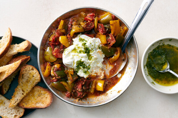 - To serve, place the taktouka at the center of a rimmed serving plate. Place the burrata on top and drizzle the burrata with the lime-parsley oil, if using. Enjoy with lots of bread. You can make the taktouka in advance and serve it warm or at room temperature. If you make it in advance, keep it in a sealed container in the refrigerator.