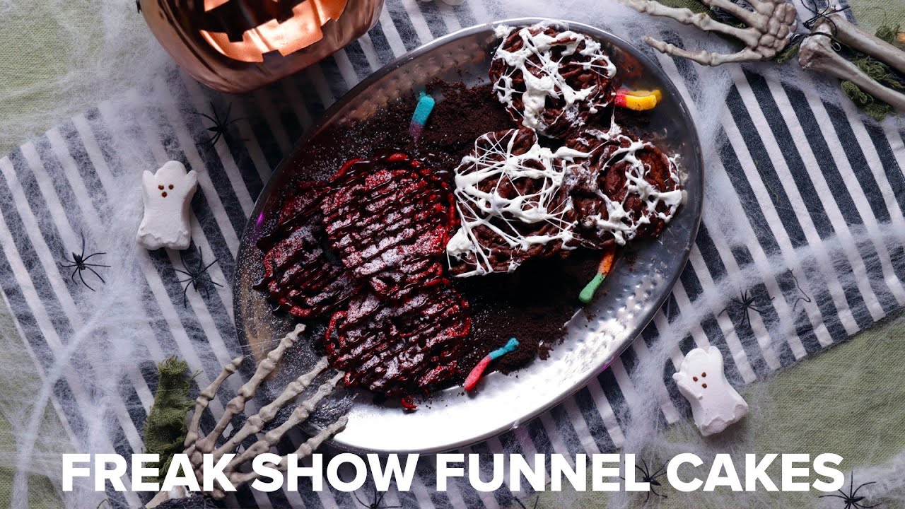 Bring the carnival home this Halloween season with these freak show-inspired “blood red” and “cobweb” funnel cakes. Finish them off with your favorite critter candies for an extra-spooky touch!