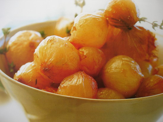 Sweet, golden shallots are good with all sorts of main dishes, including poultry or meat. Shallots have a less distinctive aroma than common onions and a milder flavour; they are also considered to be easier to digest. These caramelized shallots are also excellent with braised or roasted chestnuts, carrots or chunks of butternut squash. You may like to garnish the shallots the shallots with sprigs of fresh thyme before serving.