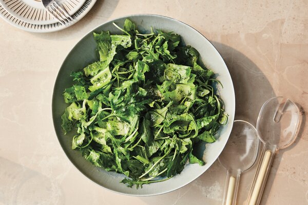 - Add a couple of tablespoons of the vinaigrette to the salad greens, and toss, adding more as needed to evenly coat. The salad should be lightly dressed, not drowned. Taste for seasoning, adjusting with more salt and pepper as desired.