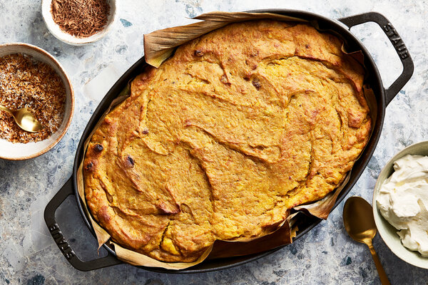 4. Transfer sweet potato, pumpkin and plantain to the bowl of a stand mixer fitted with a whisk attachment, or a large mixing bowl if using a handheld electric mixer. Let cool for 5 to 10 minutes, then add remaining 3 tablespoons of softened butter and blend on medium speed until smooth, about 3 minutes. Add wet ingredients and blend to fully incorporate. Add dry ingredients and blend until mixture is silky smooth and resembles a loose pudding, about 2 minutes.