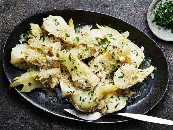 - In a 12-inch high-sided skillet, melt butter over medium. Add shallots, season with salt and pepper, and cook, stirring occasionally, until softened and lightly golden, about 5 minutes. Add oil and garlic, and stir until fragrant, 1 minute. Add fennel, wine, lemon juice, oregano, parsley and 1½ cups of water, and season with salt and pepper. Bring to a boil over high, stirring to evenly coat the fennel in the liquid. Arrange the fennel in an even layer.