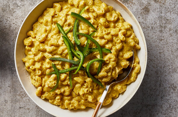 - Working in batches if necessary, blend the potatoes, carrot, cashews, chiles, nutritional yeast and the reserved potato cooking water until smooth. Taste and season with salt. Add the sauce to the pasta and stir to coat. Turn the heat to low and let sit for about 5 minutes so the pasta absorbs some of the sauce. Serve hot, garnished with the reserved chiles.
