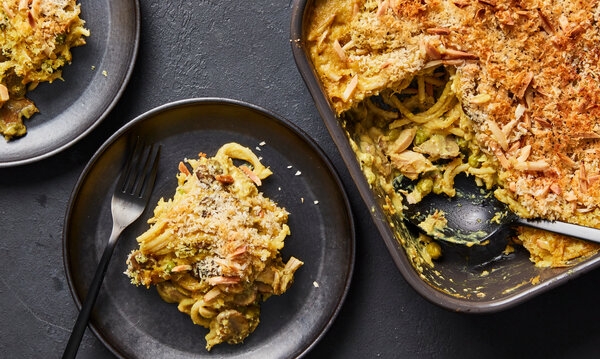 4. Transfer to a 9-by-13-inch baking dish. Melt the remaining tablespoon of butter in a small bowl in the microwave, and toss it together with the panko and the almonds. Sprinkle the panko-almond mixture all over the top of the pasta, and bake until bubbly and browned on top, about 25 minutes. Let the casserole rest for 5 minutes before serving. It will be very creamy at first but will firm up as it cools.