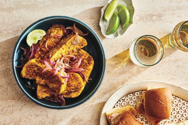 - Heat the broiler, then broil the paneer for a minute or two to brown it a little further. Lightly dust the paneer with the amchur spice mix. Serve hot with the onion from the pan, lime wedges and toasted, buttered buns.