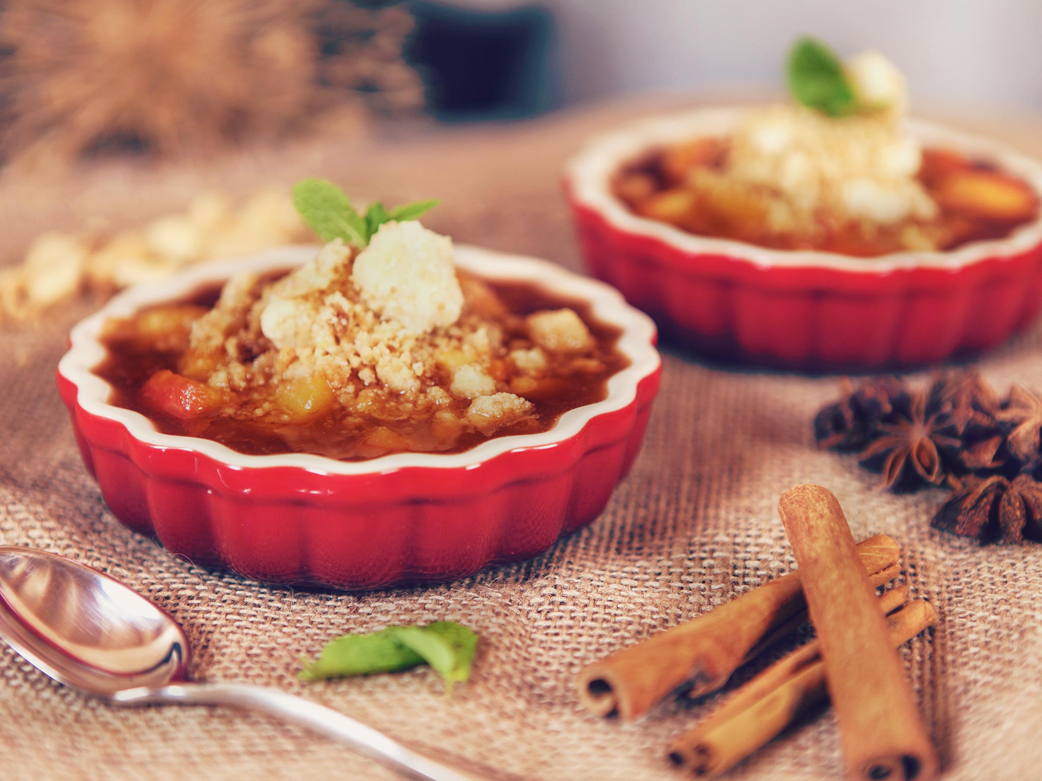 Next, reduce everything for approx. 5 min. on a low heat. To serve, fill serving bowls with the compote and lay the slightly cooled crumbles on top. Serve with whipped cream as desired.
