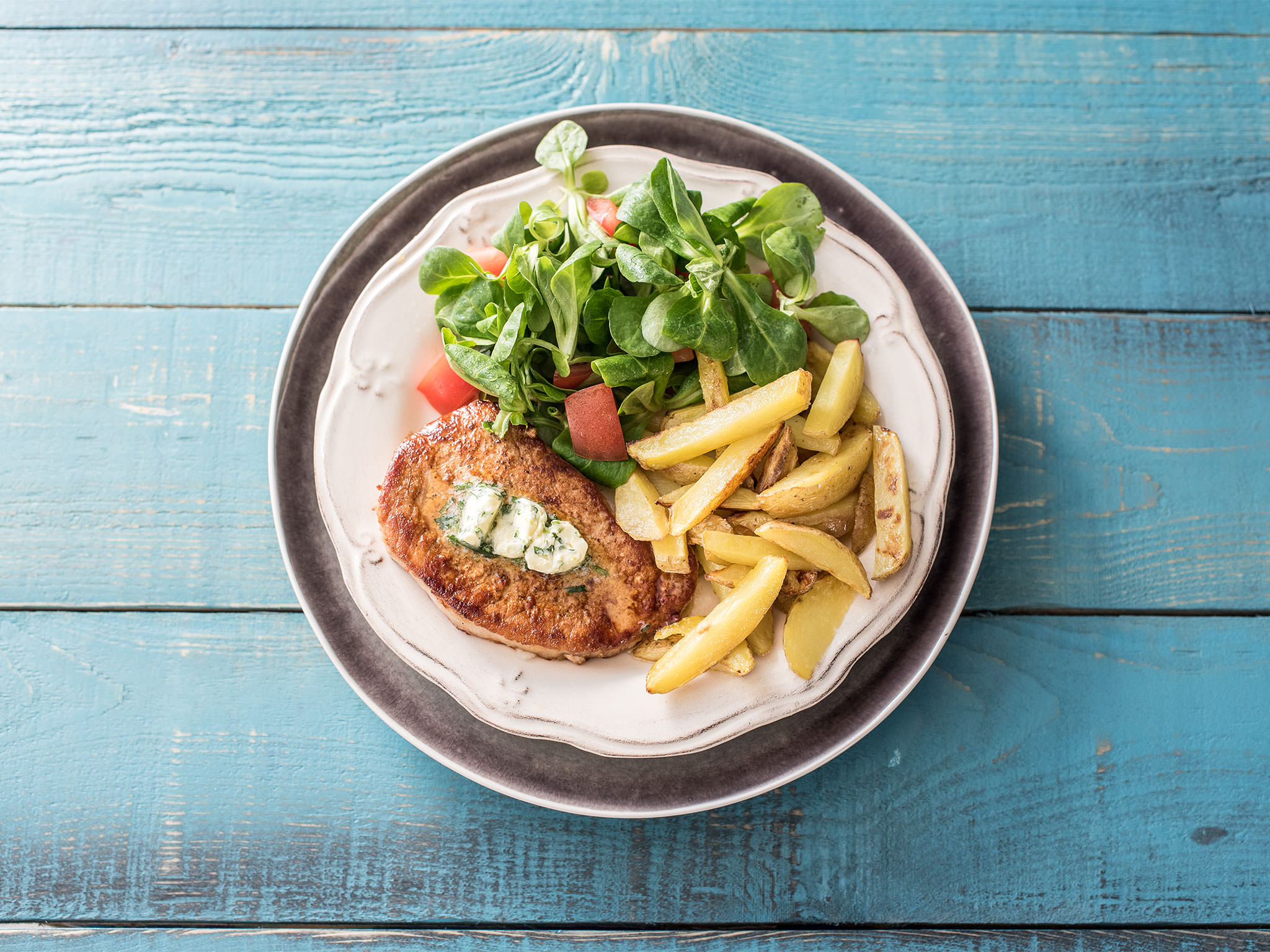 500 g pork steak / 3 tbsp olive oil / 1 tbsp vinegar / 1 tbsp Dijon mustard / 2 tomatoes / 100 g salad / salt / pepper