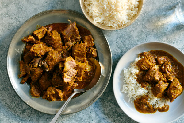 - Pour the puréed mixture into a 6- to 8-quart slow cooker. Stir in the cinnamon stick, jaggery, cumin, turmeric, chile powder and cayenne (if using). Add the pork and stir to evenly combine. Cover and cook on high until the flavors have blended, the oniony taste is no longer sharp, and the pork is very tender, about 5 hours.