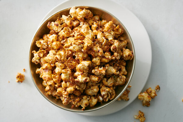 - In a large, heavy-bottomed pot, combine the sugar, butter, corn syrup, salt and 1 tablespoon water. Cook over medium-high heat, stirring with a large metal spoon or rubber spatula, until the butter melts and the mixture turns into thick bubbling syrup, about 1 minute. Cook until it begins to smell toasty, about 1 more minute, then add the popcorn, carefully tossing every 2 to 3 seconds, until it starts to brown lightly, another 1 to 2 minutes. Begin tossing constantly for another minute or two until the popcorn turns deep golden brown in most spots, being careful to never let it burn. Remove from the heat, sprinkle with the cinnamon and toss a final time to coat.