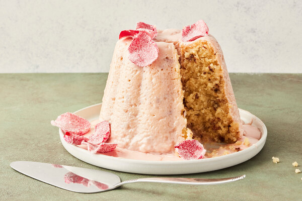 6. While the pudding cools slightly, make the icing: In a medium bowl, combine the confectioners’ sugar, butter, jelly, mace and rose water. Beat or whisk until smooth, then stir in the milk. If the icing is too thick to pour, add more milk by the tablespoon.