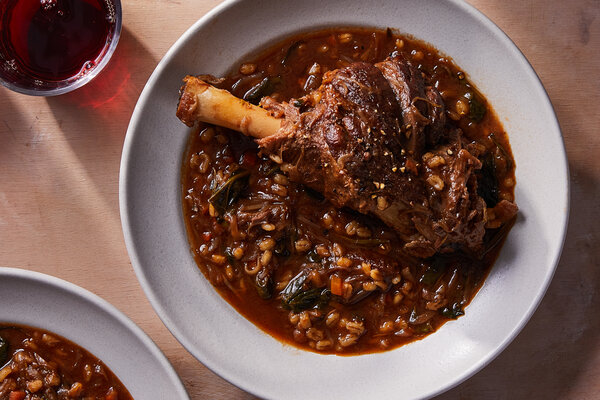 - Return the lamb shanks to the pot. Increase heat to high, bring the pot to a simmer, and transfer to the oven. Place a lid on top, leaving it cracked by an inch or so. Cook for 2 1/2 hours, then remove from oven. Flip the lamb, and stir the barley and spinach into the broth, making sure it’s all submerged. Return to the oven, cover with the lid cracked, and continue cooking until a metal skewer inserted into the lamb meets very little resistance, the meat falls off the bone with a little tug, and the barley is fully cooked but still chewy, 30 to 45 minutes longer.