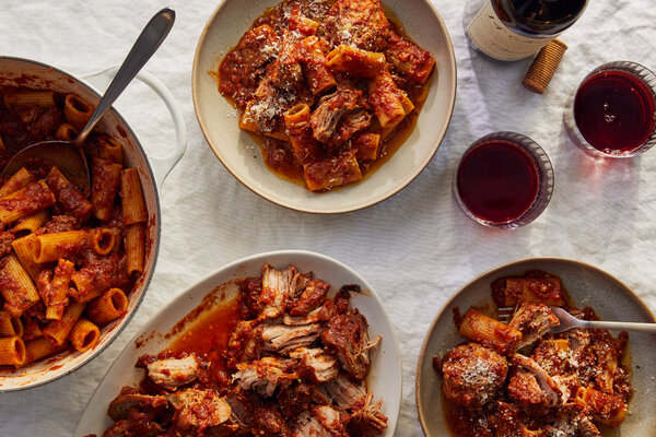 - When you’re ready to eat, bring a large pot of salted water to a boil. Add the pasta to the boiling water and cook according to package instructions until al dente. While the pasta cooks, slice the sausage and shred the pork shoulder. Transfer to a platter along with the meatballs and a few spoonfuls of sauce. Reserve ½ cup pasta water, then drain and add the pasta to the pot of sauce. Over medium heat, toss the pasta with the sauce, adding pasta water as needed until the sauce clings to the pasta.