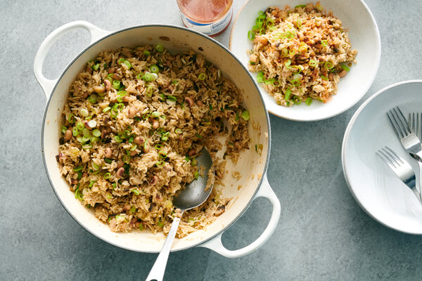 - Cover and reduce heat to low. Cook until rice is tender and liquid is absorbed, about 15 minutes. Scatter over black-eyed peas in an even layer, cover and cook 3 minutes longer. Turn off heat.